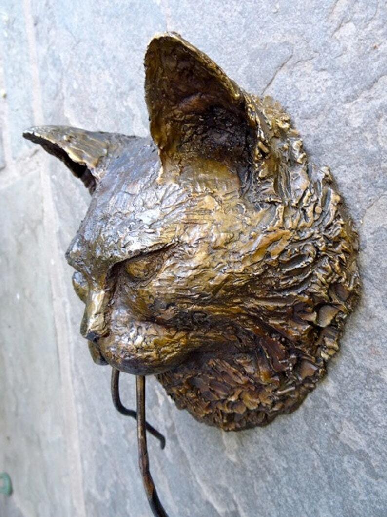 The sculpture is life-size (cat head roughly 4-5" each way). Can be easily mounted on a front door using brass screws, which we will provide, or on a board for wall mounting.