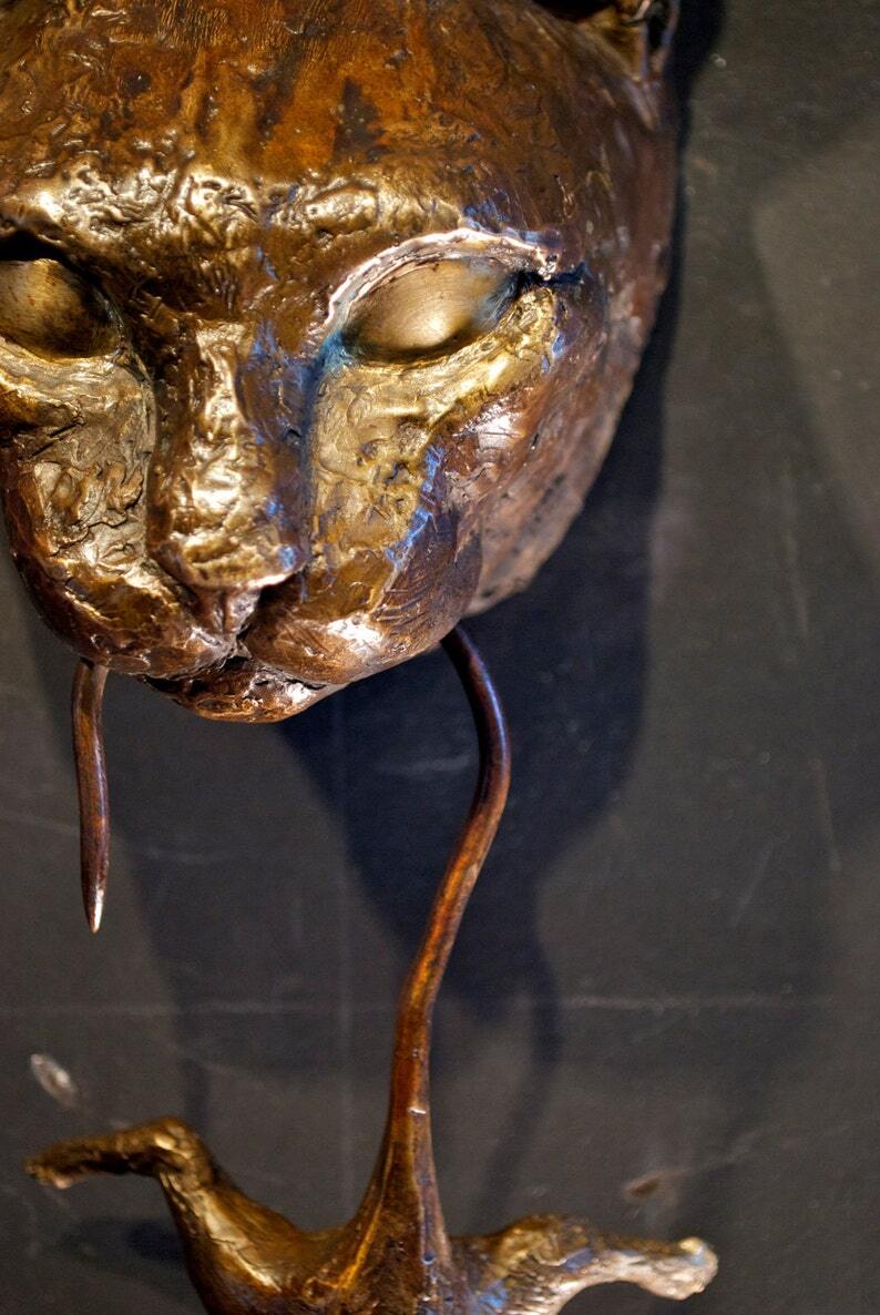 Beautiful original bronze cat portrait of Augie with swinging mouse in his mouth, designed for use as door knocker or wall sculpture.